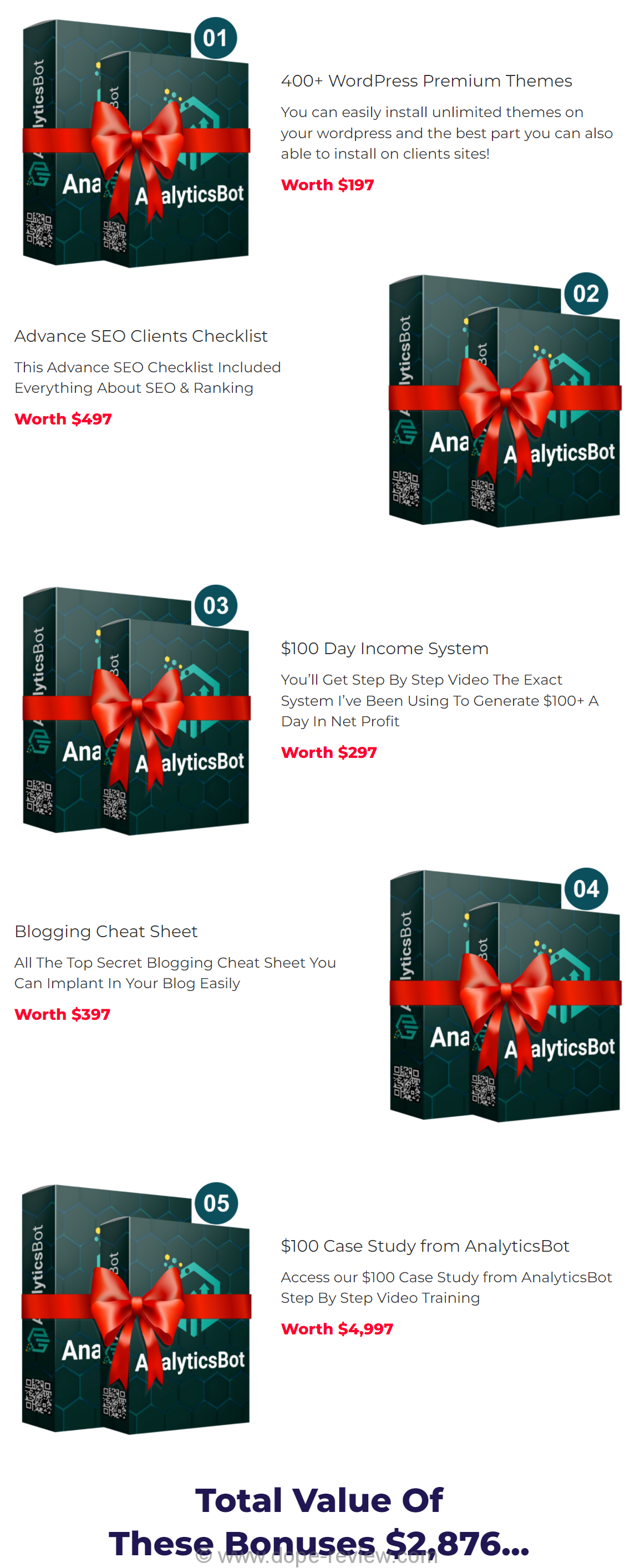Special Bonuses for the Dope Review Audience: You’ll get all the bonuses listed on the Salespage, but I’m going to give you guys a SPECIAL bonus as well. If you Download AnalyticsBot via any link on this page you’ll also get my bonus package $2100 Value. Believe me, my bonus package will save you time, money and make your life a little easier !