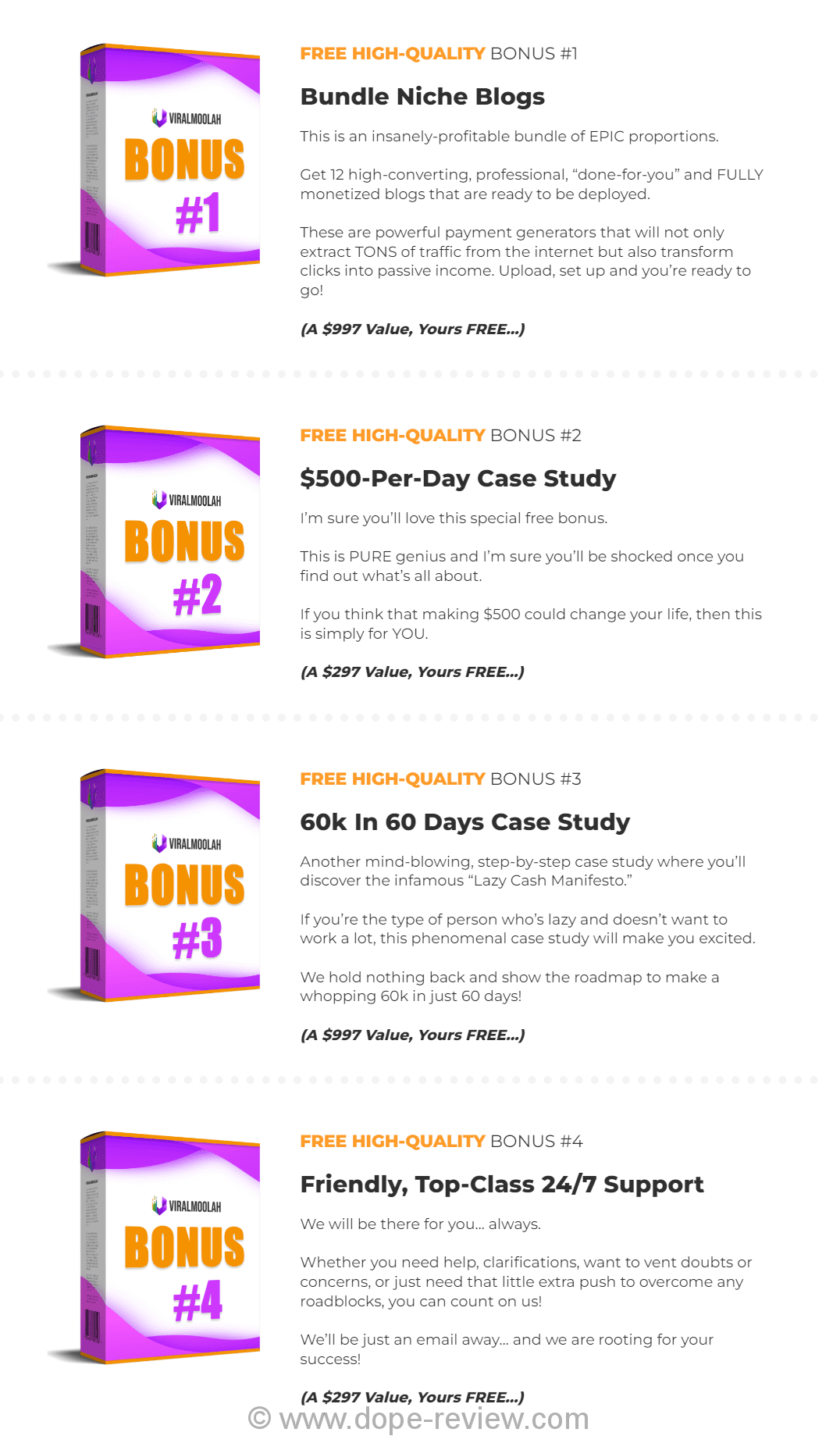 Special Bonuses for the Dope Review Audience: You’ll get all the bonuses listed on the Salespage, but I’m going to give you guys a SPECIAL bonus as well. If you Download ViralMoolah via any link on this page you’ll also get my bonus package $2200 Value. Believe me, my bonus package will save you time, money and make your life a little easier !